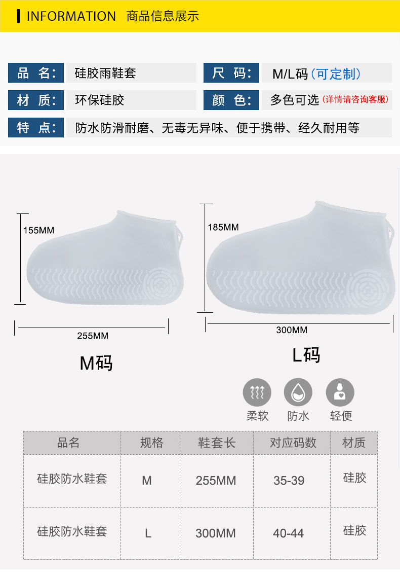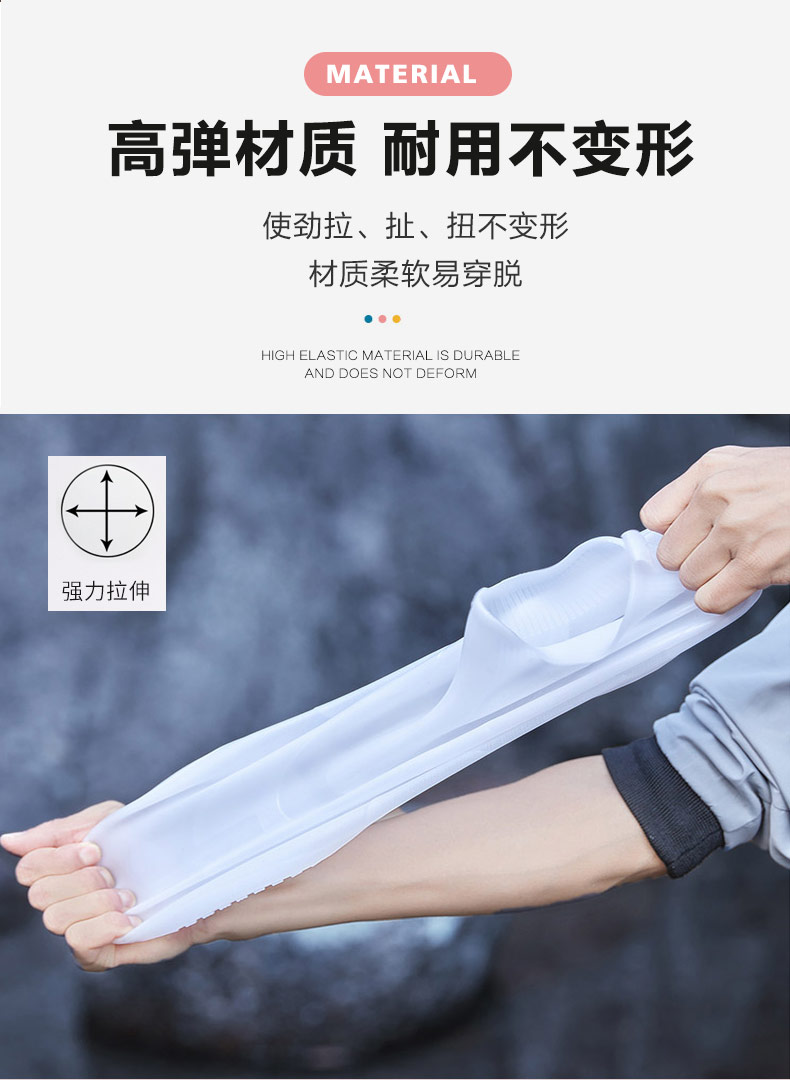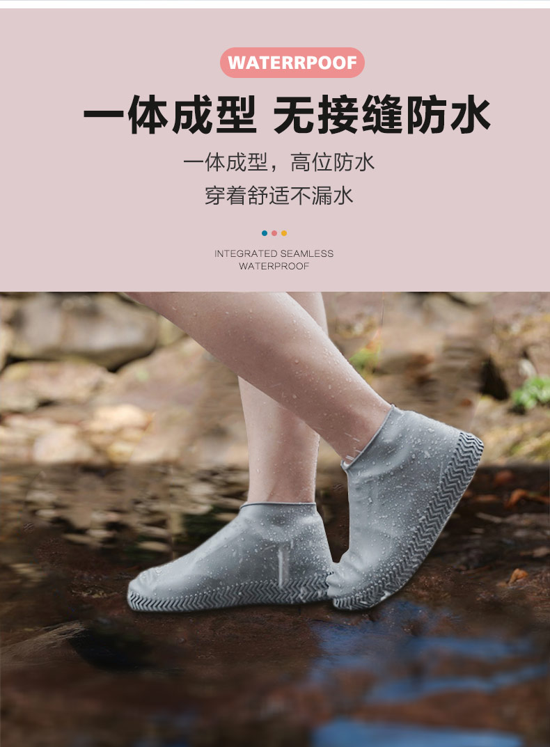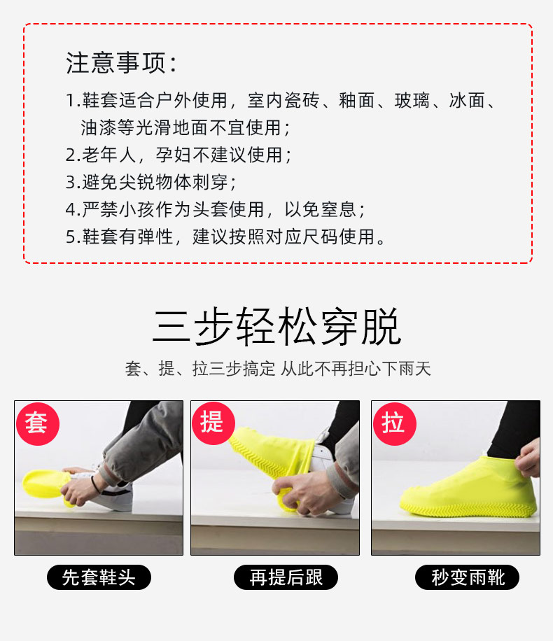這款硅膠防水鞋套使用的時候就比較方便了,在需要使用的的時候把鞋套進去就可以了,小巧方便,不占地方又不影響美觀,方便省時,重要的是,即使是大雨磅礴的天氣,你的鞋子依舊可以完好無損。它使用的是食品級硅膠原材料制作的,環保安全,無異味,不會讓你聞到任何廉價塑料的味道。